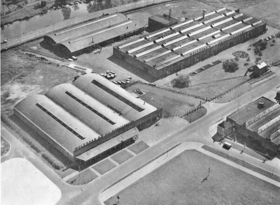 Rechtsboven de assemblage fabriek waar de beroemde Morris Minor en Oxford en de J2 + J4 bestelwagens geassembleerd werden.